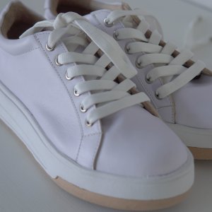 Zapatilla en cuero liso blanco. Detalle de ojales y herretes metálicos. Base de goma combinada en blanco y suela. Altura de base 3,5 cm. Cordones blancos de algodón. Interior forrado en cuero a tono con la base.