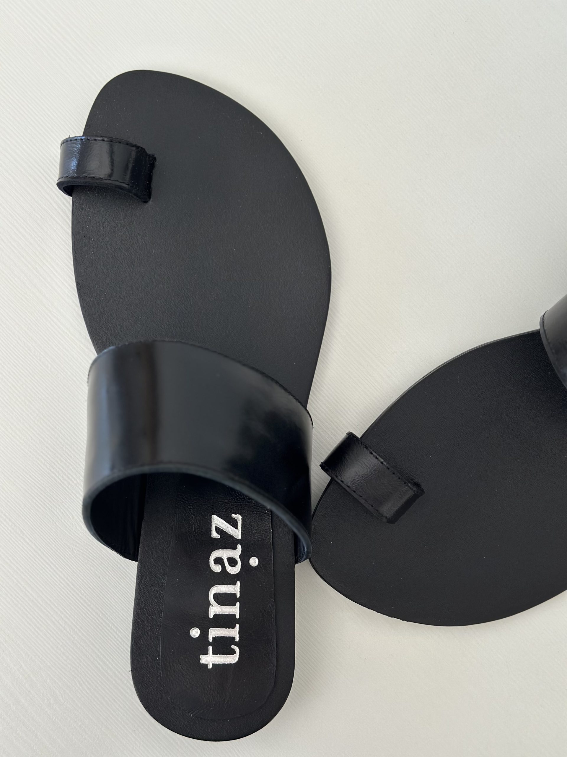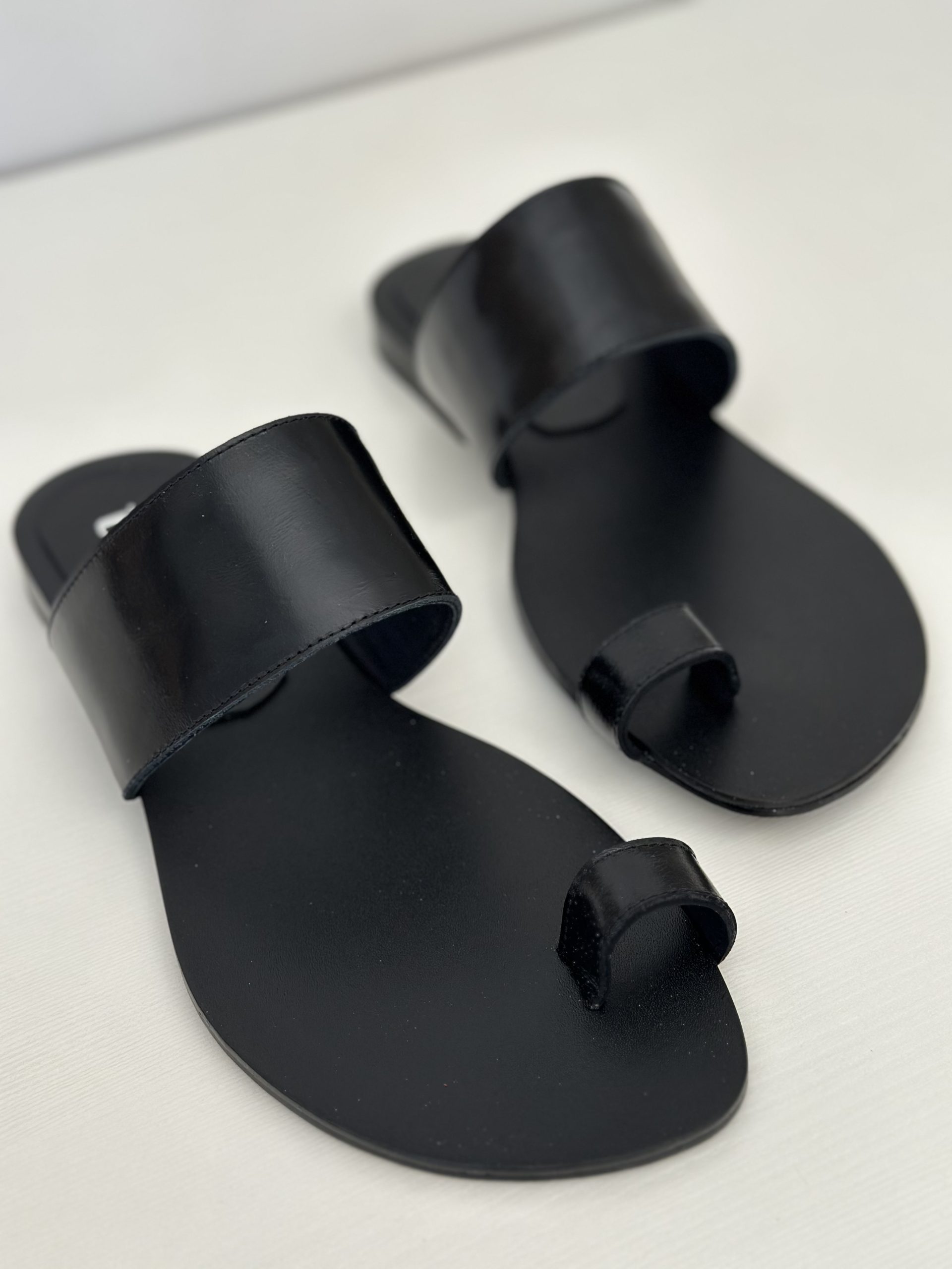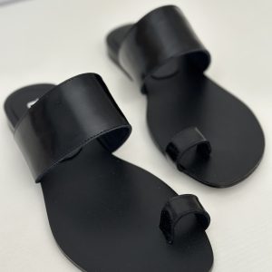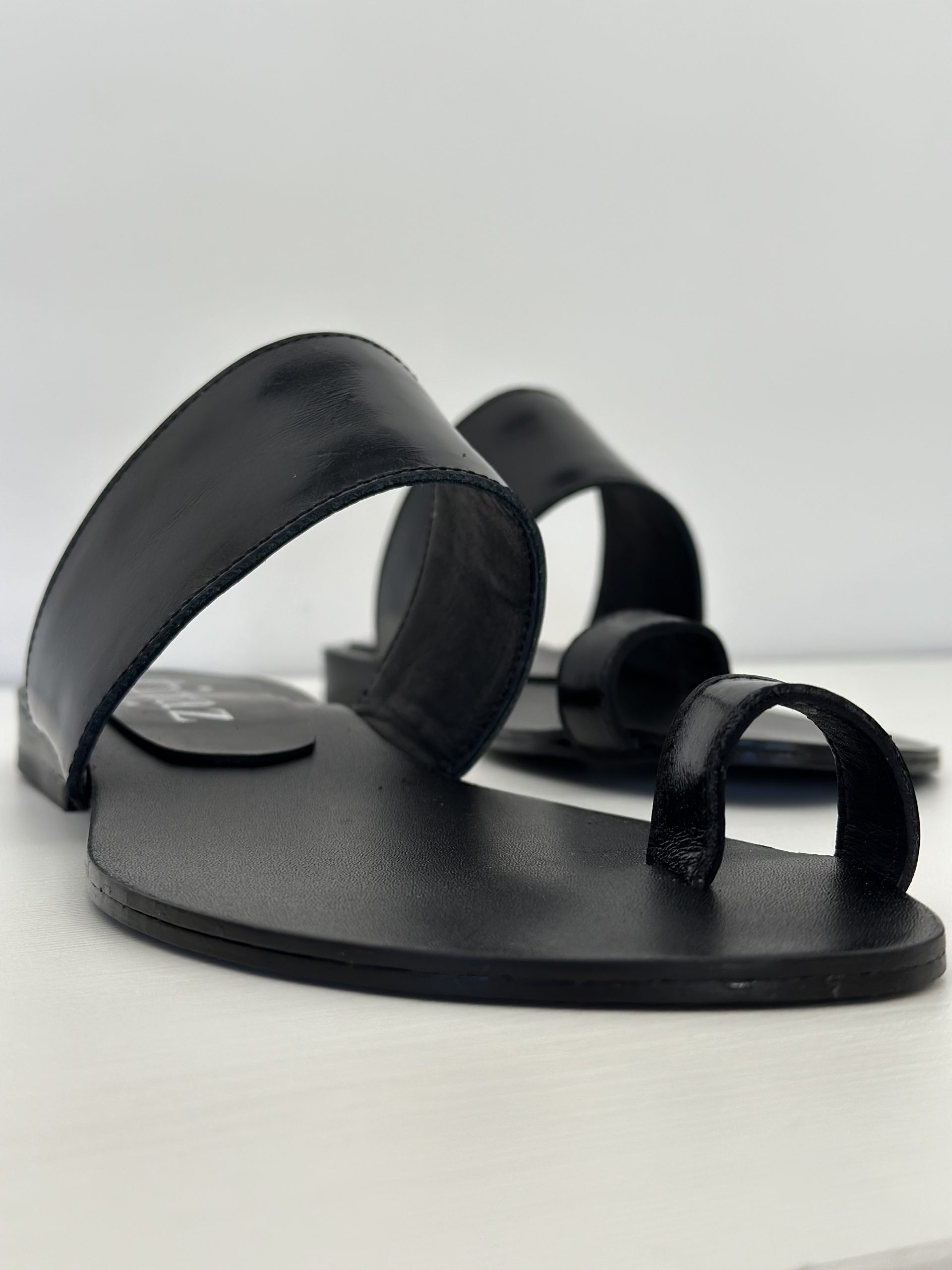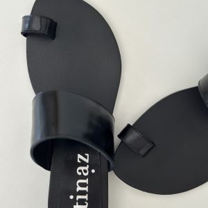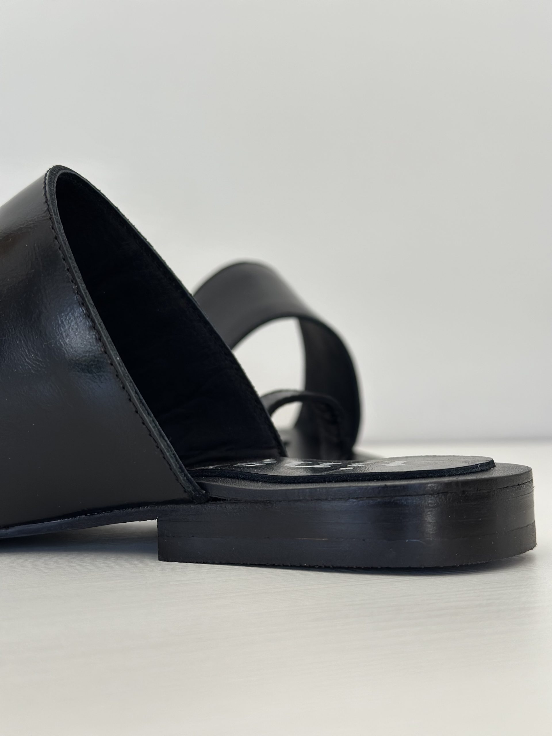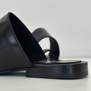 Chata en cuero negro suela con tira en el empeine y tira en dedo gordo. Taquito de 1,7 cm.